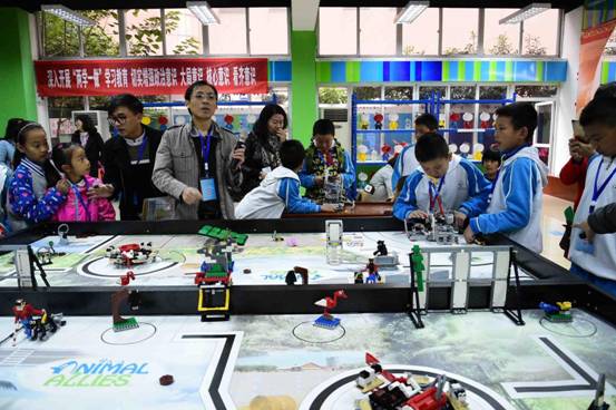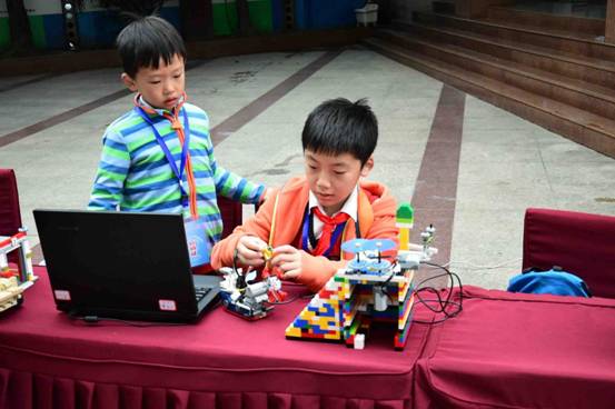 接下来,伴随着裁判长、学生代表的发言,主持人宣读了大赛须知,正式比赛大幕终于拉开了。来自自全区20多所中小学两百余名同学和老师们热情饱满得参加了创客秀和能力挑战两个类别的竞赛活动,创客秀,就像一个脑洞大开的party,3D打印、学生小发明作品、Scratch作品、Arduino作品、各种创意机器人,舞蹈机器人,应有尽有,学生们可以为自己喜欢的创作,点赞,颇具乐趣。而WER工程挑战赛、FLL工程挑战赛、消防先锋机器人障碍灭火赛、超级轨迹赛等能力挑战竞赛项目,也是开展的如火如荼,学生们按照大赛组委会命题要求进行编程,让智能机器人完成相关任务,现场比赛气氛热烈,学生们兴趣盎然。
