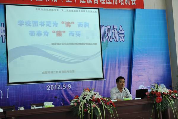 为进一步推动全市中小学图书馆(室)建设管理应用工作,提升图书管理人员素质,开展阅读指导教学活动,促进图书装备效益发挥。由成都市教育技术装备管理所主办,锦江区电化教育馆承办、成师附小白鹭溪分校协办的“2012年成都市中小学图书馆(室)建设管理应用培训会”于5月9日在锦江区成师附小白鹭溪分校顺利召开,来自各区(市)县教仪电教站(馆)长、教仪站分管图书工作同志示范校图书管理人员、市直属学校分管图书馆工作分管领导及图书管理人员、锦江区各校分管领导及图书管理人员几百人参加了此次会议。