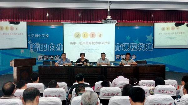 为确保今年信息技术考试工作的顺利开展,成华区于6月16日下午在石室初中召开区各中学分管校长及教务主任参加的“成华区2014高中、初中信息技术会考考务工作会”,区教育局教育局分管副局长叶树文、进修校副校长周步俊、教育二科科长邓丽、区电教馆馆长谭伟出席会议。