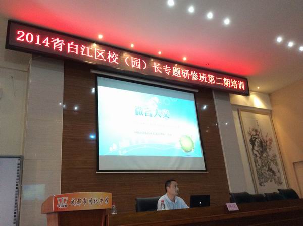 8月19日,由青白江区教育局主办,青白江区教育研究培训中心和成都基督教青年会联合承办的2014年青白江区校(园)长专题研修班第二期培训在成都市川化中学成功举行。下午,成都市教育技术装备管理所张庆所长在培训会上作了《微言大义—从微课兴起到教学方式变革》的专题讲座。