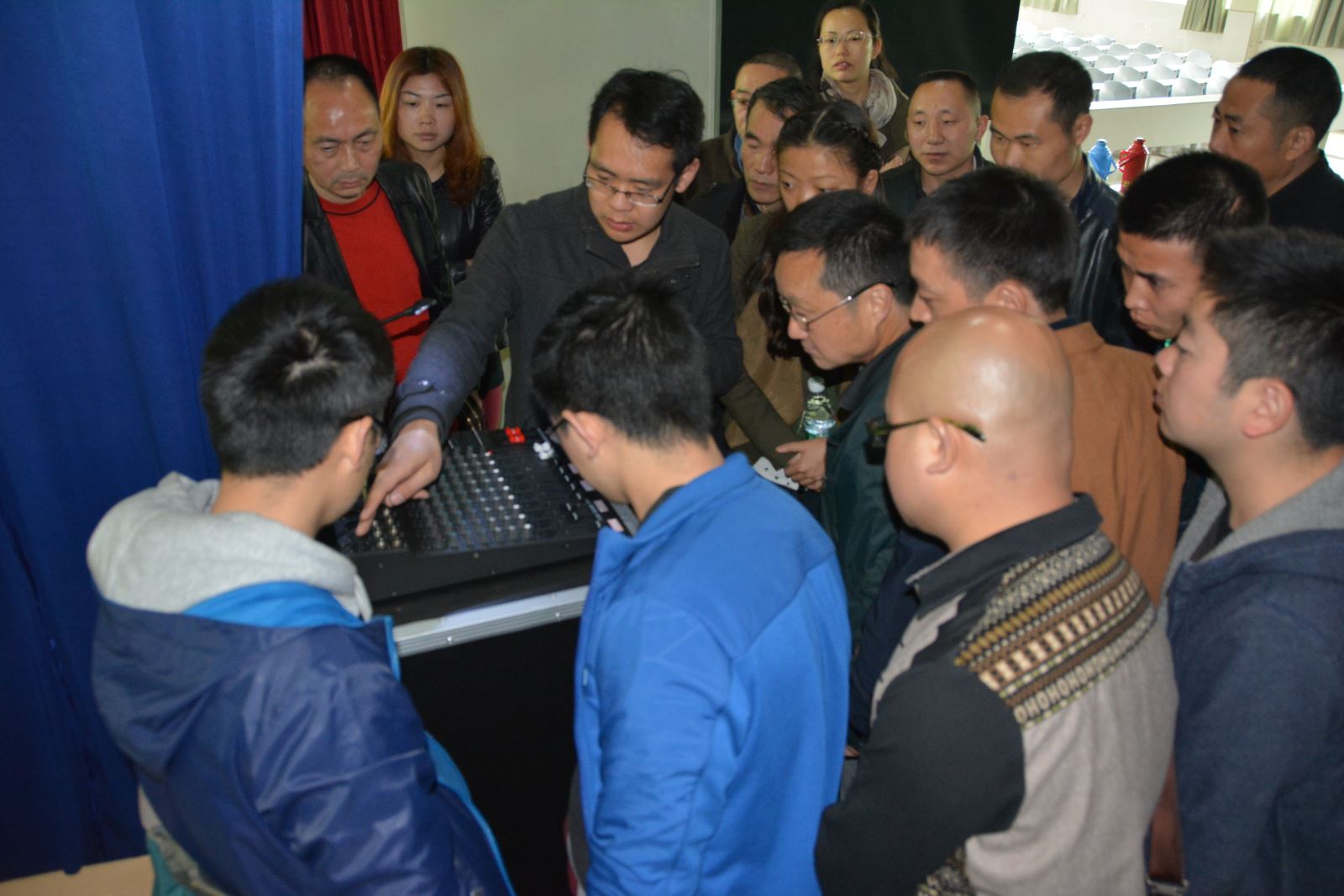 技术人员黄老师先对各学校配备的音响系统进行了初步了解,然后从音响系统的组成、音响的连接、音响系统的使用和调试以及系统的维护和应急措施进行了详细的介绍和说明。并对在场的20多名准音响师进行“手把手”的指导和“一对一”过关。