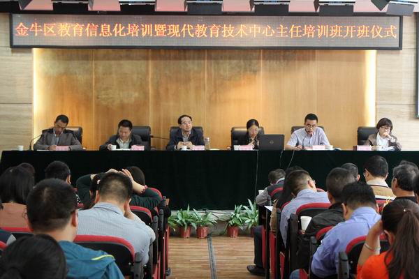 2015年10月10日,金牛区首届现代教育技术中心主任研修班在金牛区教育研究培训中心正式开班。成都市教育技术装备管理中心研究室张延蓉主任,金牛区教育局文贤代局长,区教育研究培训中心高汉宁主任、易立铁副主任,区教育局设备科林涛科长、张秋副科长及区各中小学、民办校、子弟校分管信息化的校级干部和我区首届现代教育技术中心主任培训班学员参加开班仪式。
