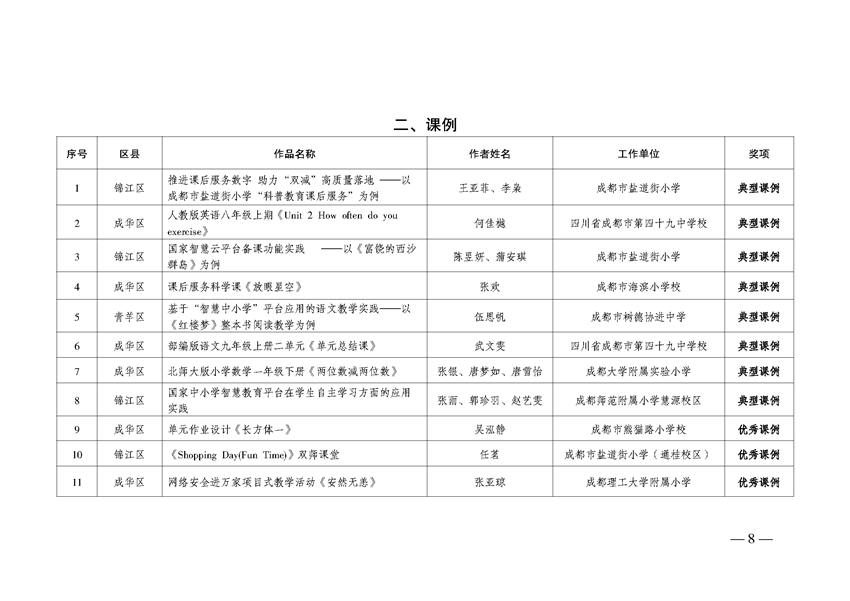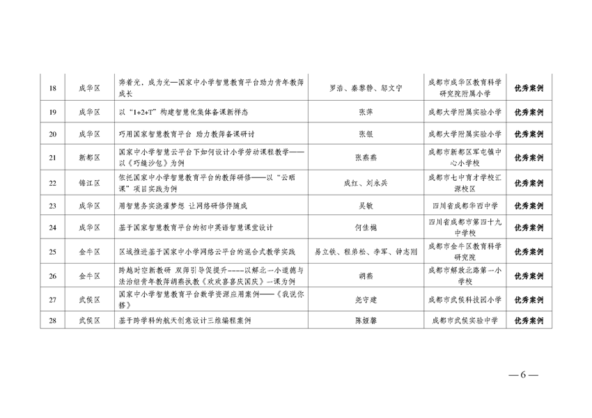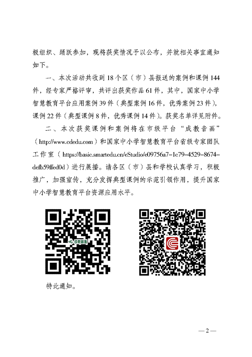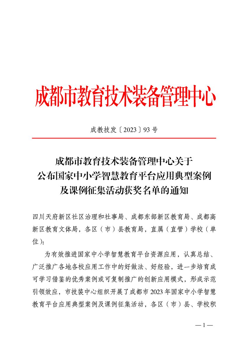 成都市教育技术装备管理中心关于公布国家中小学智慧教育平台应用典型案例及课例征集活动获奖名单的通知
