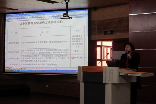 会上,法律顾问吴秋思律师就《政府采购法》、《政府采购法实施条例》等政府采购相关法律法规的适用范围、基本特征、采购的基本原则、组织形式、方式和程序以及采购目录等方面作了培训。成华区教育系统部门集中采购办李娜对各单位自行组织的采购项目采用的采购方式进行了详细讲解。成华区教育系统部门集中采购办公室主任谭伟结合教育系统政府采购实例对《成华区教育系统政府采购管理实施办法(试行)》进行了解读,强调了政府采购工作的重要性与采购过程中的注意事项,在规范采购行为、规范项目审核、项目使用效益评估等方面作了明确要求,同时要求各单位建立和完善政府采购工作管理制度,坚持依法开展政府采购活动。