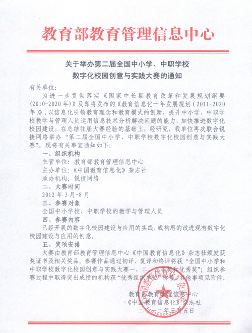 转发教育部教育管理信息中心《关于举办第二届全国中小学、中职学校数字化校园创意与实践大赛的通知》