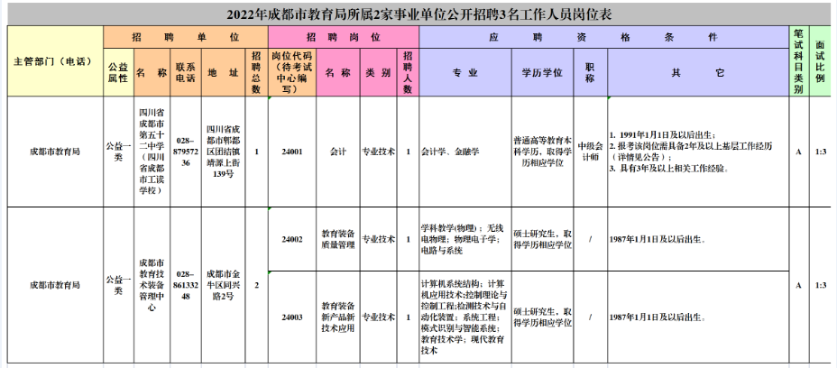 附件:1.2022年一季度成都市教育局所属2家事业单位公开招聘3名工作人员岗位表