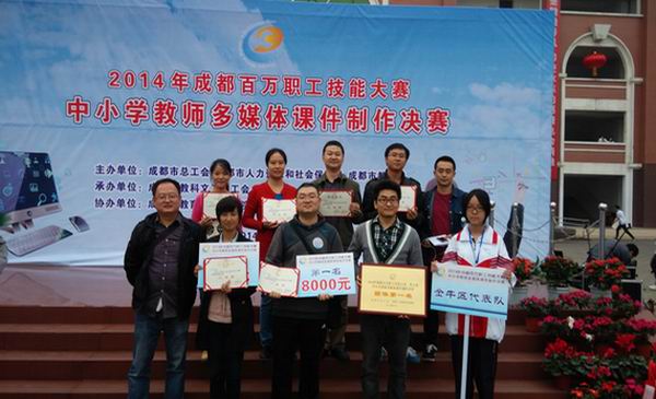 10月22日,2014年成都百万职工技能大赛中小学教师多媒体课件制作决赛在崇州市崇庆中学举行。金牛区教育局代表队参加此次比赛,获得了比赛团体总分第一名,钟志刚老师荣获全市第一名,田希老师荣获二等奖,段小红老师荣获三等奖,毛斌老师、乔建龙老师以及王乐峥老师荣获优秀奖。