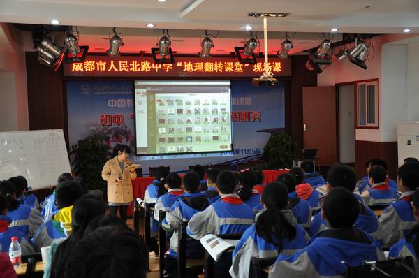 11月27日,金牛区“翻转课堂”课题研究组在金牛区人民北路中学开展了一次“翻转课堂”专题研讨活动。人北中学地理老师师璐用一节地理“翻转课堂”拉开了这一新型教学模式。她首先告知大家:学生已通过2个微视频教学及学案对本课知识作了前置学习,她根据学习平台获取到的学生学习目标达成情况作了二次备课。接着,师璐老师围绕“优秀学案点评”、“你来纠错”、“你来帮忙”、“你来判断”、“巩固提升”五大环,具体展示了如何解决学生课前生成问题及突破重难点,以及及时掌握学生作业提交和反馈达成情况等,并以“抢擂”与“攻擂”的形式展示了小组学习情形。示课过程中,全区地理老师表示出了浓厚的兴趣与好奇。