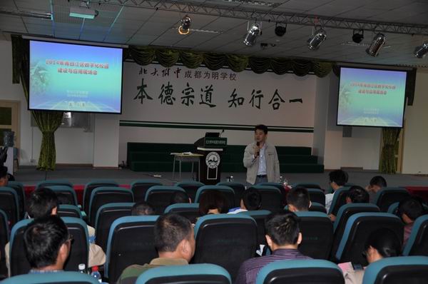 会上,区电教馆馆长蔡显金传达了青教电字【2014】14号《青白江区教育局关于加强数字校园建设与应用的通知》精神,对数字化校园建设与应用工作作出具体部署与安排。北大附中成都实验学校信息技术中心主任孙丹江介绍北大附中成都实验学校开展数字化校园建设与应用情况以及关于学信系统使用的经验交流。北京为明学信总公司运营部总监朱老师具体介绍了学信系统的功能并逐个演示,接着区电教馆李华金对青白江区构建“移动互联网支撑下的新学校”(学信)项目工作作了布置安排。