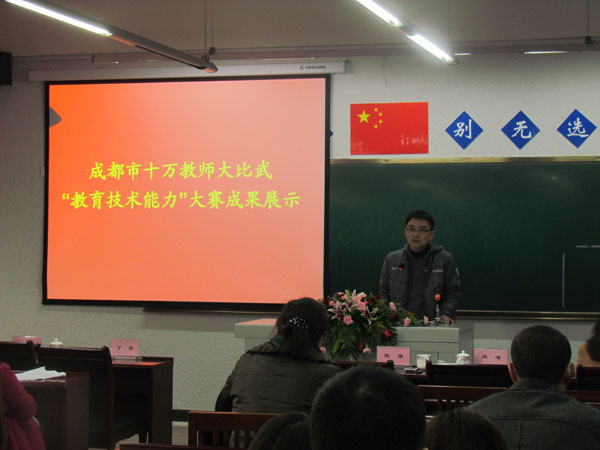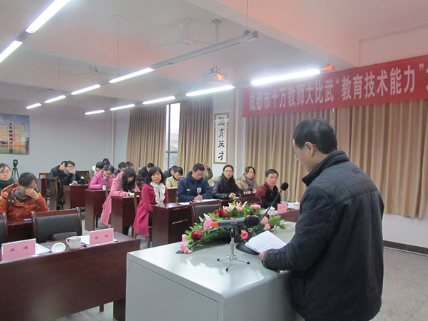 市教育局高师处张强处长代表成都市教育局作了热情洋溢的讲话。大赛获奖教师献上了各有特色的三堂展示课。与会专家针对三堂课的教学设计、教育技术与课堂教学的整合情况及课堂实施效果作了中肯的点评。四川师范大学周雄俊副教授作题为《教育技术视野下的教学设计与课件的制作》的专题讲座。