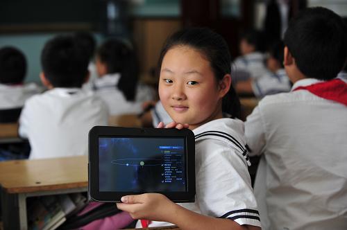 不久前在哈尔滨香滨小学举办的全国信息化教学现场观摩活动上,来自各省区市教育行政部门的有关人士到场观摩。图为哈尔滨香滨小学学生在展示使用的教学平板电脑。(资料图片)