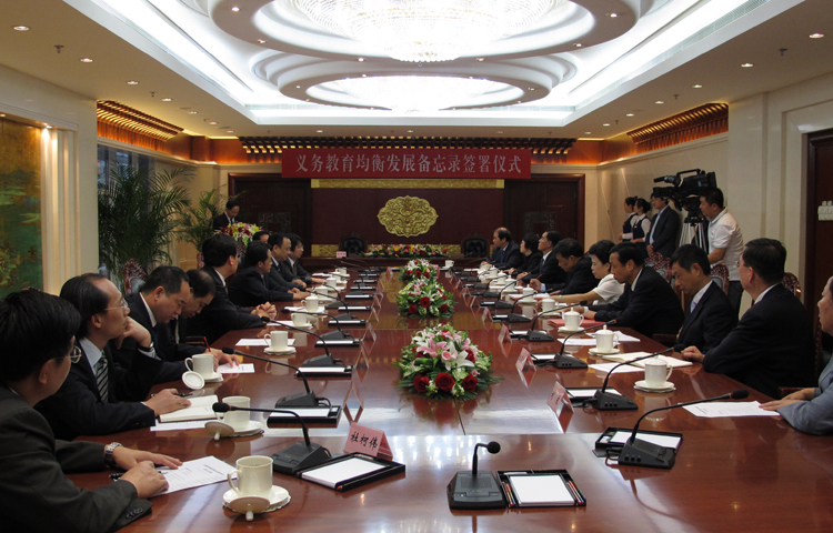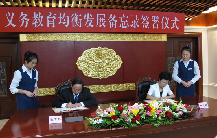 日前,教育部与我省以及甘肃、西藏、青海等四省区签署了义务教育均衡发展备忘录。今后我省将积极推进义务教育均衡发展,保障所有适龄儿童少年接受更加公平、更高质量的义务教育。教育部部长袁贵仁、四川省副省长黄彦蓉代表教育部和省政府在备忘录上签字。签署仪式由教育部副部长刘利民主持,省教育厅厅长涂文涛、省政府教育督导团总督学刘东出席了签署仪式。