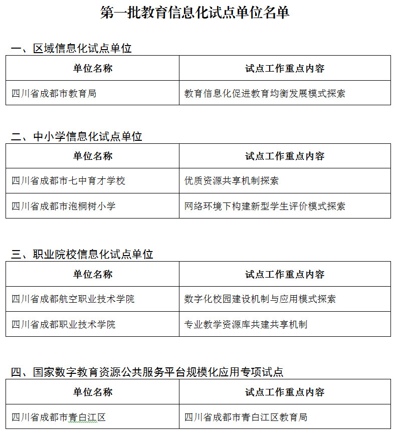 2012年11月15日,教育部下发《关于公布第一批教育信息化试点单位的通知》(教技函[2012]70号),正式批复第一批教育信息化试点单位。我市六单位获批,具体为: