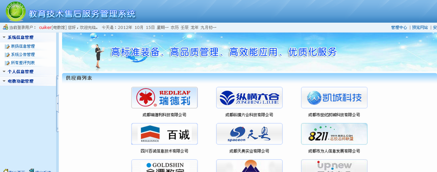 近日,“锦江教育技术售后管理平台”正式上线运行。该平台由锦江区教育局电教馆完成开发建设。系统将全区近5年来教育技术装备所有项目录入建库,学校可以方便地查询涉及本校的装备项目的内容、实施公司、售后服务要求和售后服务时间,并根据每个项目所对应公司的售后服务情况,对其进行差评和扣分或发送表扬信,以督促相关公司更好地完成售后服务工作。