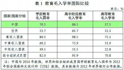 教育总体发展水平进入世界中上行列。2014年,我国小学净入学率、初中毛入学率,以及高中阶段、高等教育毛入学率均超过中高收入国家平均水平。