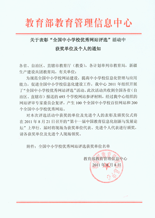 为规范全国中小学校网站建设,提高中小学校信息化管理与应用能力,促进全国中小学校信息化建设工作,我中心2011年组织开展了“全国中小学校优秀网站评选”活动,此次活动共收到全国各省(自治区、直辖市)报送的693个学校网站参评材料,经过我中心组织的网站评审专家委员会复评,产生100个全国中小学校百佳网站和200个全国中小学校优秀网站。