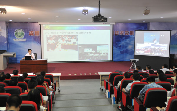 培训会上,锦江区电教馆负责人剖析了制约“e课堂”常态的机制瓶颈,讲解了互动教学直播平台(空中e课堂)的构成和运作体系。接着,现场模拟训练开始,参培人员在讲师引导下,分别就“远程观摩”“互动课堂”“微格教学”“空中教研”四种模式进行了实践操作。通过在线观看七中育才学校全自动录播教室实时教学等多种现场的分角色模拟,参培人员快速掌握了对e课堂四种模式的支持技术。会议最后,与会者进行了热烈的交流。