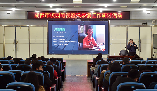 为培育我市中小学校园影视高质量发展,进一步提高校园电视台工作人员的技术水平,强化学校摄录编队伍建设,2018年12月14日,由成都市教育技术装备管理中心主办,成都市锦江区教育局电化教育馆承办的“成都市校园电视暨摄录编工作组研讨会”在锦江区天涯石小学召开。来自各区(市)县电教馆(站)长、2018年四川省中小学校园电视活动部分获奖学校、摄录编工作组成员及校园电视工作人员共100余名教师参加了此次会议。